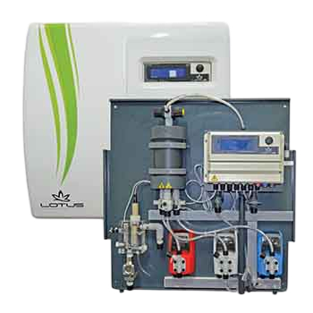 Системы биологического контроля LOTUS на основе диоксида хлора надежны и безопасны, так как они не требуют работы с газом СlО2: два жидких химических вещества, соляная кислота (HCI) и хлорит натрия (NaCIO2), взаимодействуют друг с другом, образуя необходимый диоксид хлора, таким образом, газ СlО2 или концентрированные растворы отсутствуют за пределами технологического применения.