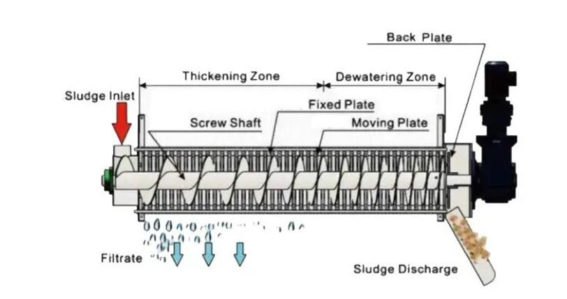 Машина для обезвоживания осадка шнековым прессом использует принцип шнековой экструзии за счет сильной экструзионной силы, создаваемой изменением диаметра и шага шнека, а также небольшим зазором между подвижным кольцом и неподвижным кольцом, для реализации экструзии и обезвоживания осадка. Новый тип оборудования для разделения твердой и жидкой фаз. Установка для обезвоживания осадка шнековым прессом состоит из составного шнекового корпуса, приводного устройства, резервуара для фильтрата, системы смешивания и рамы.